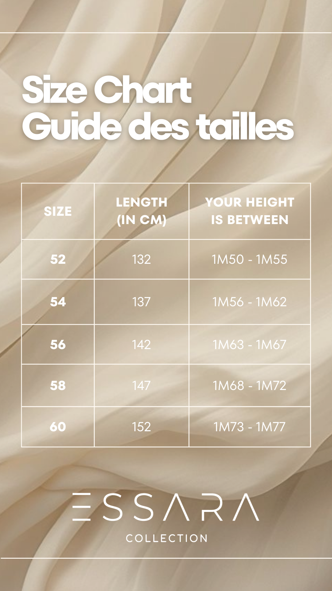 Tailles émiraties allant de 52 à 60. (voir tableau des tailles en photo).